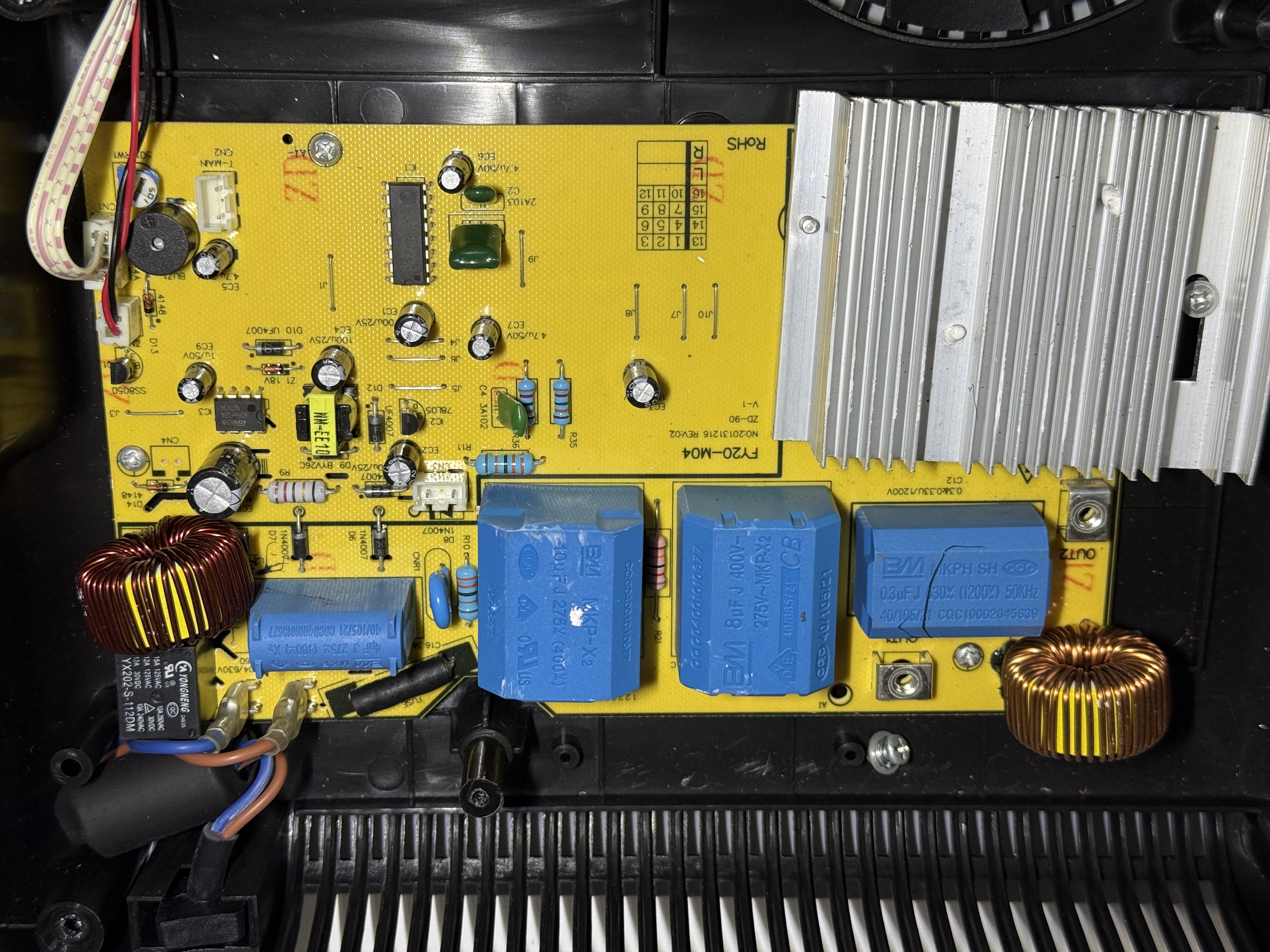 Die große Leistungsplatine liegt im hinteren Bereich der Kochplatte: Rechts oben befinden sich Netzrelais und -filter (bestehend aus dem kleinsten der vier blauen Folienkondensatoren und der Spule). Links unten sitzt der massive Kühlkörper mit dem Leistungs-IGBT sowie die darüber platzierten Resonanzkondensatoren, durch deren Zu-/Abschaltung unterschiedliche Leistungsstufen erreicht werden können.