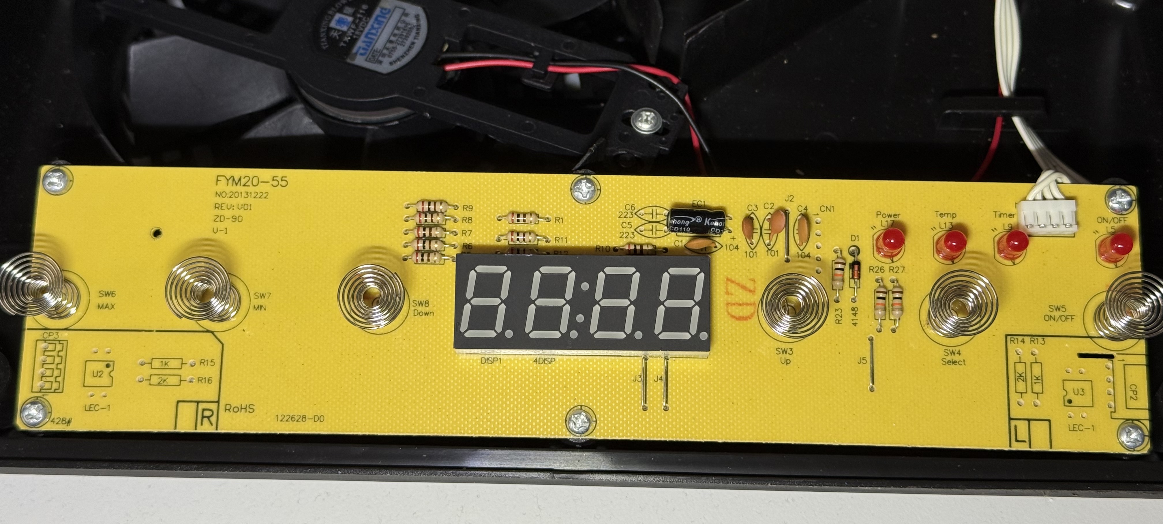Im vorderen Bereich ist die separate Frontplatine mit LEDs, LED-Display und kapazitiven Sensortasten angeordnet, direkt unter der Bedienleiste.