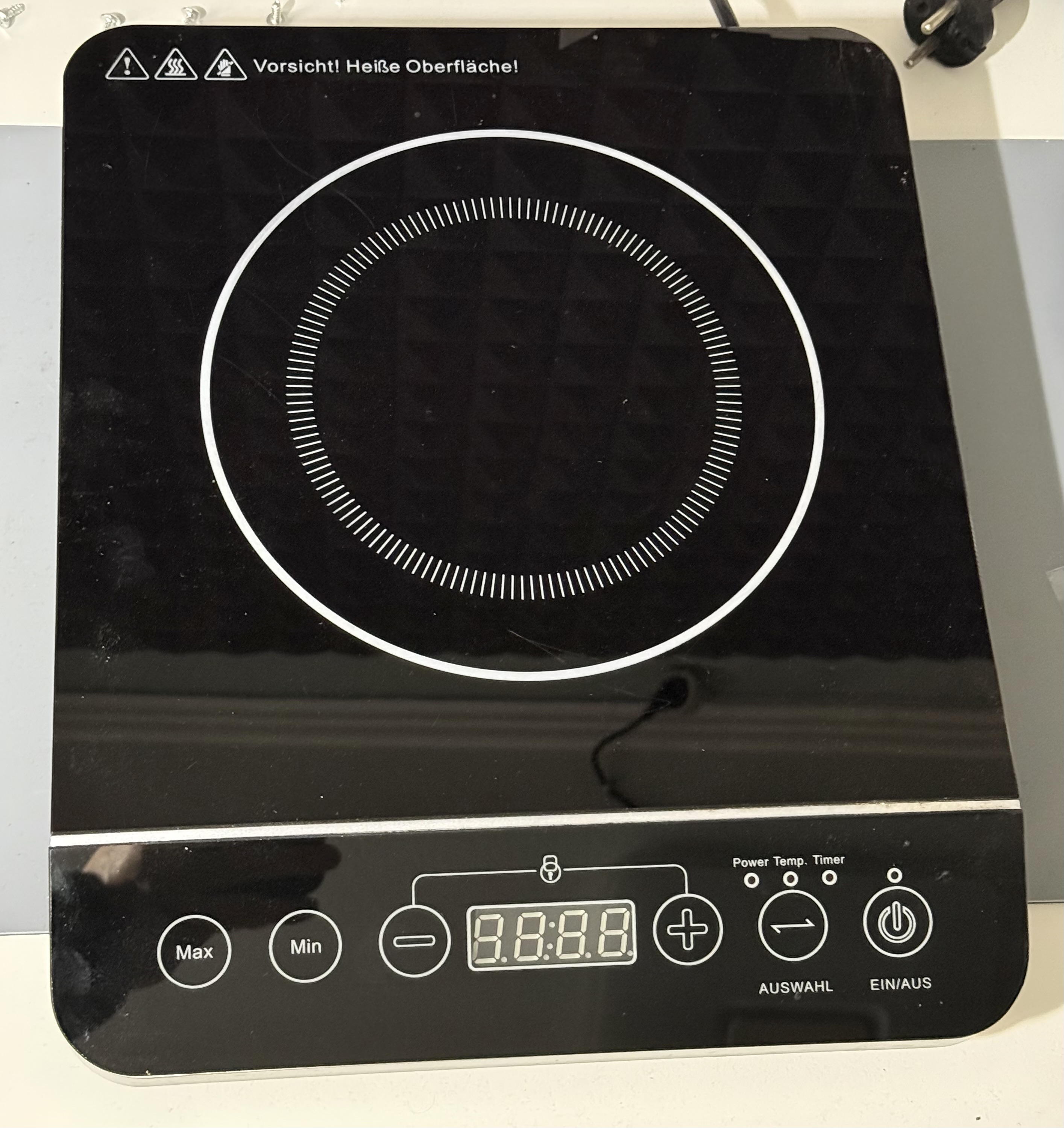 Die Induktionskochplatte hat eine glatte, schwarze Glasoberfläche mit einer zentralen, weiß markierten Kochzone. Die Bedienleiste befindet sich im unteren Bereich und besteht aus berührungsempfindlichen Tasten sowie einem digitalen Display. Das Gehäuse ist flach, rechteckig und überwiegend in Schwarz gehalten, mit einem seitlichen Netzanschluss und dezent abgerundeten Kanten. In den Seiten und dem Boden befinden sich Lüftungsschlitze.