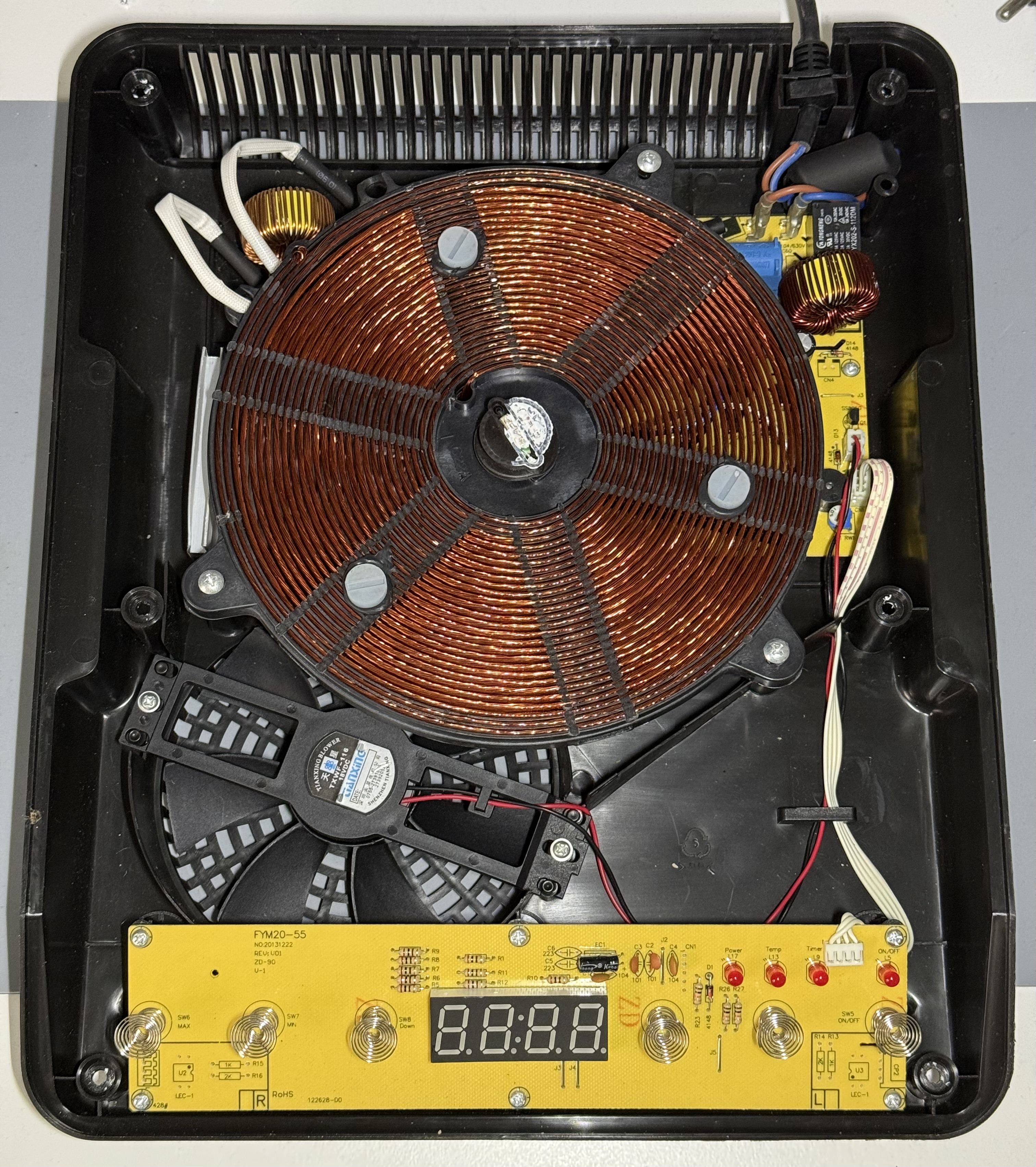 Unter der Glaskeramik liegt zentral die große, flache Kupferspule – direkt unter der markierten Kochzone. Links daneben sitzt der Lüfter, der die Elektronik kühlt indem er warme Luft aus dem Gehäuse zieht, die durch die Schlitze in der Geräterückseite nachströmt. In der Mitte der großen Spule sitzt ein Temperatursensor.