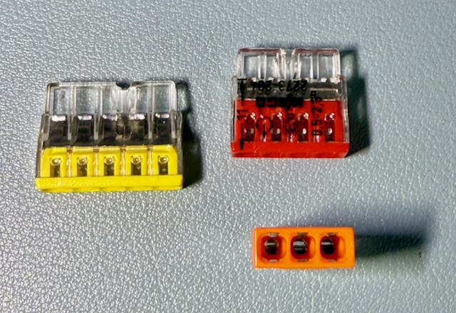 - Federklemme („WAGO“-Klemme): kompakter Kunststoffkörper, meist grau oder transparent, mit Hebeln oder farbigen Markierungen. Leitungsöffnungen sind klar erkennbar.