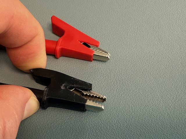 - Krokodilklemme: Durch Zusammendrücken der Hebel öffnen sich die Backen; beim Loslassen schließt die Feder die Backen und presst sie auf den Kontaktpunkt.