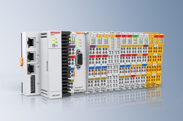 Modulare Beckhoff-SPS (EtherCAT-I/O-System). Links ein Embedded-PC/Buskoppler mit Ethernet-Ports (CX8191) ; daneben die Netzteilklemme zur E-Bus-Auffrischung (EL9410) und zwei DI-Klemmen (EL1002), rechts angereiht mehrere EL-Klemmen: z. B. EL1809 (digitale Eingänge), EL2809 (digitale Ausgänge) und gelbe TwinSAFE-Sicherheits-I/Os (z. B. EL1904/EL2904). Quelle: Beckhoff.com