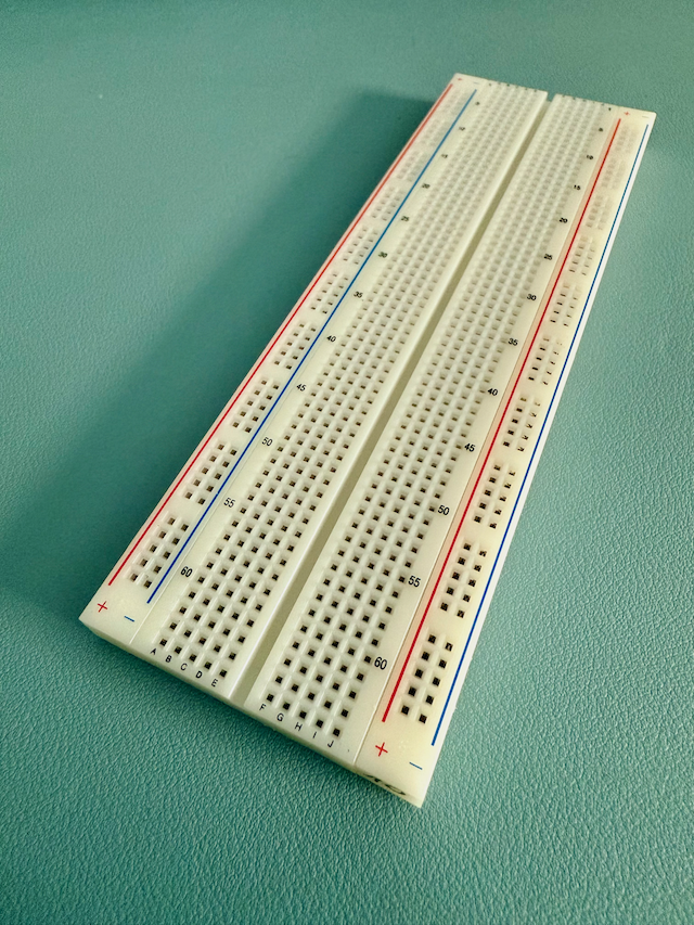 Ein Steckbrett (engl. breadboard) wie auf dem Bild gezeigt, ist ein unverzichtbares Werkzeug für den Aufbau und das Testen elektronischer Schaltungen im Labor oder Ausbildungsbereich. Es ermöglicht das schnelle und flexible Stecken von Bauteilen – wie Widerständen, Kondensatoren, LEDs oder integrierten Schaltkreisen – ohne Löten.