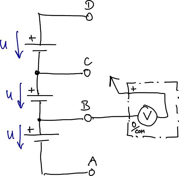 Wird das Voltmeter zwischen A (an +) und B (an 0/COM) angeschlossen, so zeigt es die Spannung an, also die Potenzialdifferenz zwischen dem Bezugspotenzial an 0/COM (hier: ) und dem Potenzial am +-Anschluss (z. B. ):