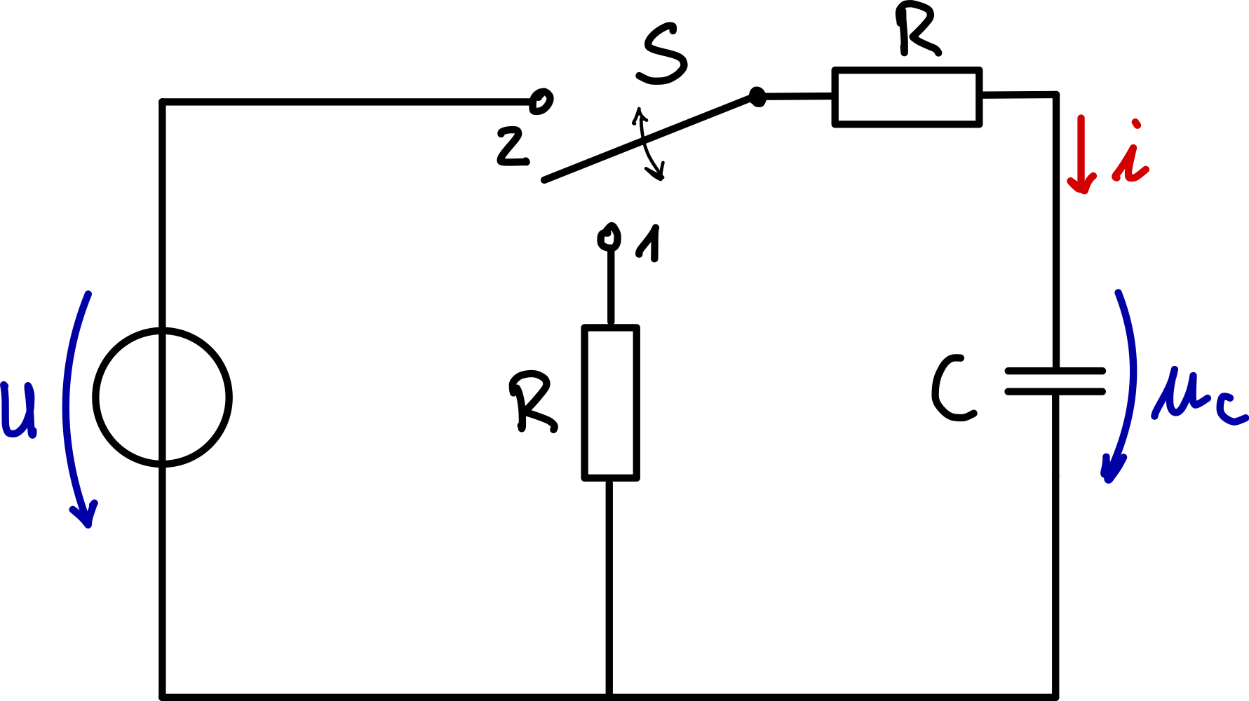 Da der Schalter minutenlang (also deutlich länger als ) in Stellung 2 war, ist der Kondensator praktisch vollständig auf die Quellenspannung geladen: