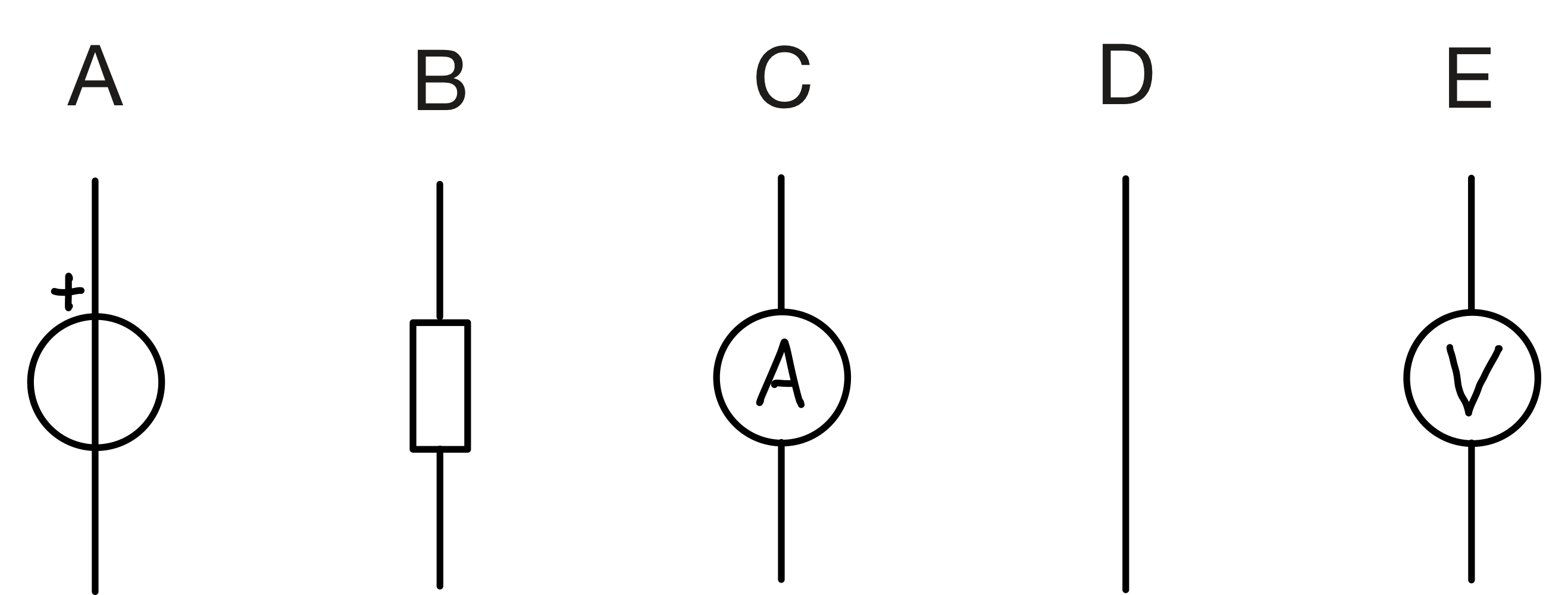 A→4 (Spannungsquelle), B→8 (Widerstand), C→6 (Amperemeter), D→3 (Leiter), E→5 (Voltmeter)