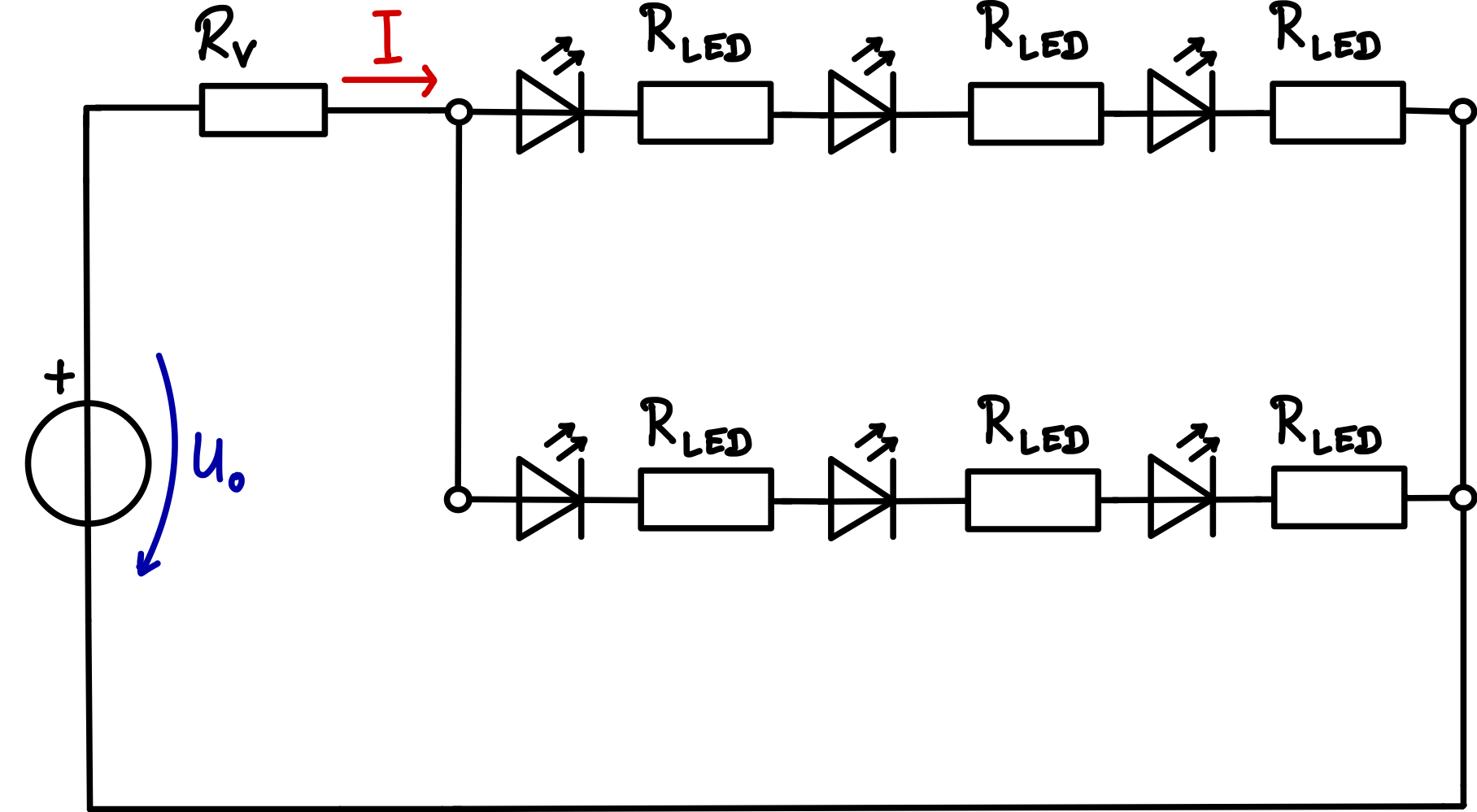 Die gesamte Anordnung wird über einen gemeinsamen Vorwiderstand an einer Gleichspannungsquelle von betrieben. Der Strom durch jeden LED-Strang soll betragen.