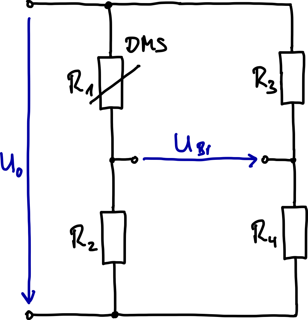 Die skizzierte Wheatstone-Brücke wird zur Kraftmessung mit einem Dehnmessstreifen (DMS) eingesetzt. Die Brücke hat folgende Widerstände: