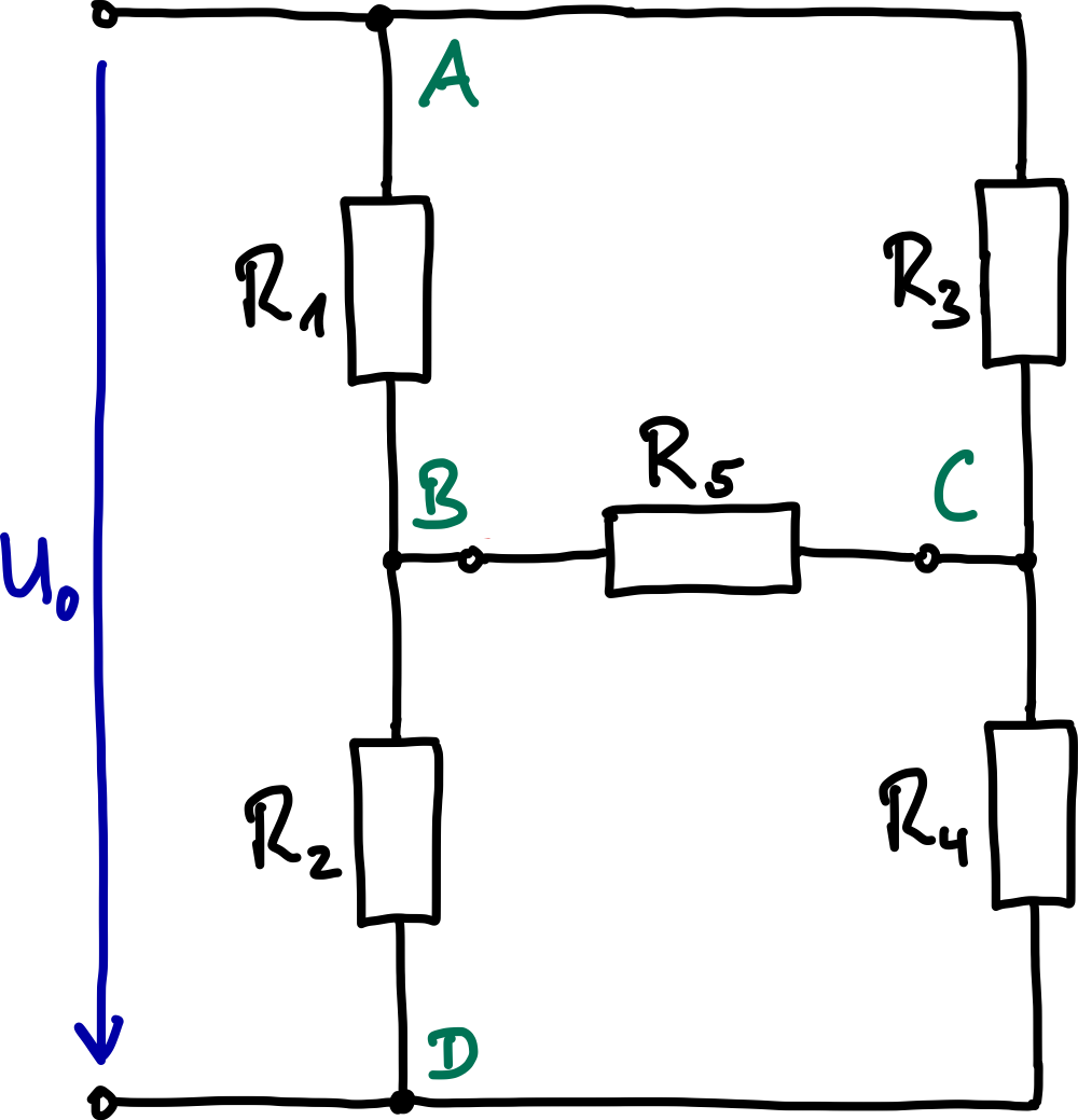 Ein Widerstandsnetzwerk hat die Form einer Brückenschaltung mit folgenden Widerständen: