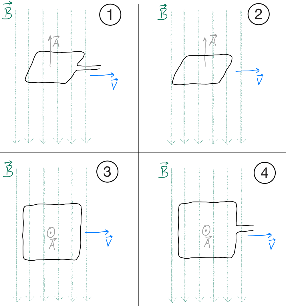 Ein Leiterschleife aus Kupfer, deren Orientierung mit der Flächennormalen gekennzeichnet ist, wird aus einem homogenen Magnetfeld (Flussdichte ) mit einer Geschwindigkeit heraus bewegt (siehe Grafiken 1 bis 4). Die Leiterschleife kann dabei offen oder geschlossen sein.