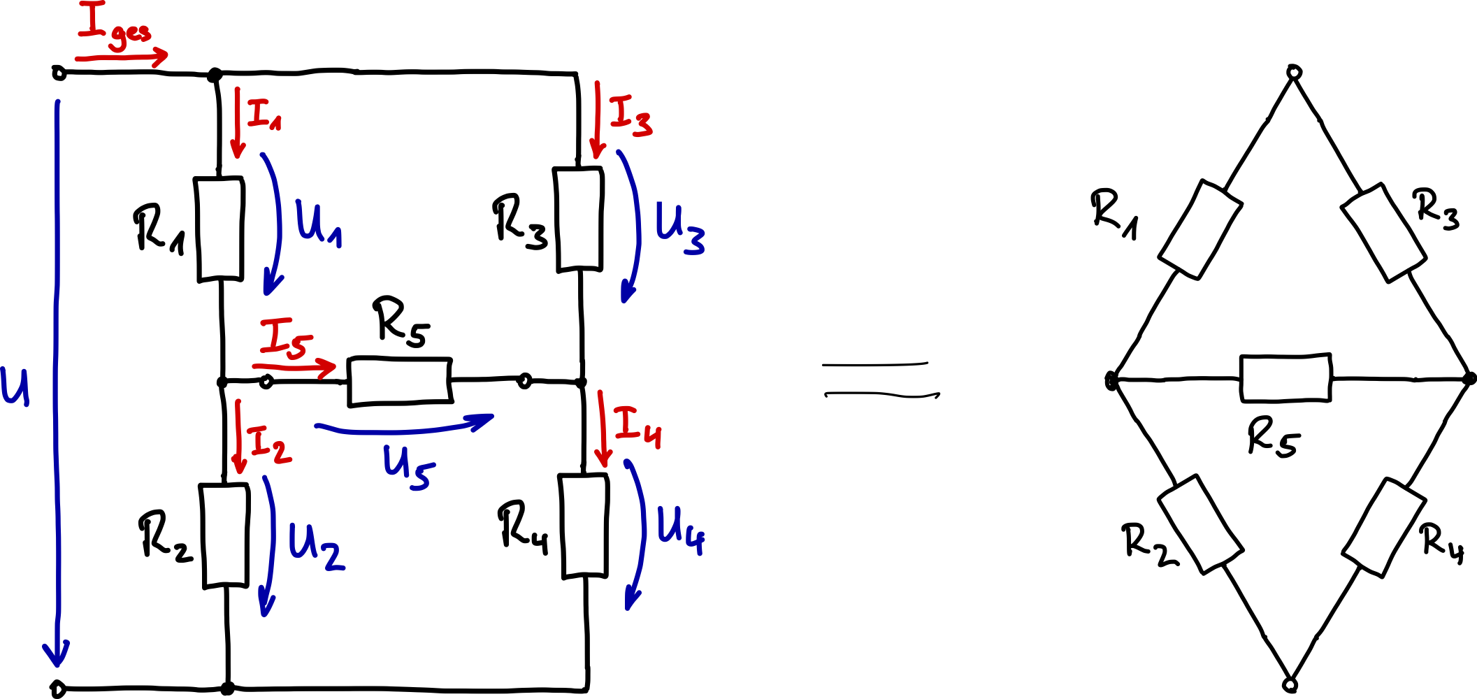 Die Brückenschaltung besteht aus vier Widerständen in „Rautenform“ und einem fünften Widerstand (Brückenwiderstand oder Messzweig) zwischen den beiden mittleren Knoten. (Die Brückenschaltung muss nicht zwingend in Rautenform skizziert werden.)