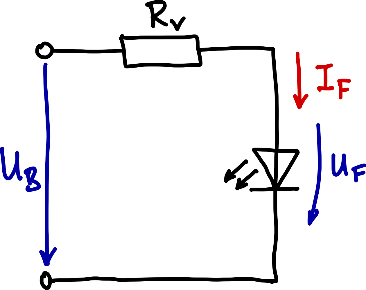 Der Vorwiderstand und die LED bilden eine Reihenschaltung. Am Vorwiderstand fällt die Differenzspannung ab: