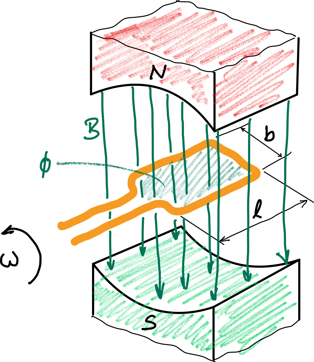 Ein einfacher Generator besteht aus einer rechteckigen Spule mit Windungen und den Abmessungen . Die Spule dreht sich mit in einem Magnetfeld mit .