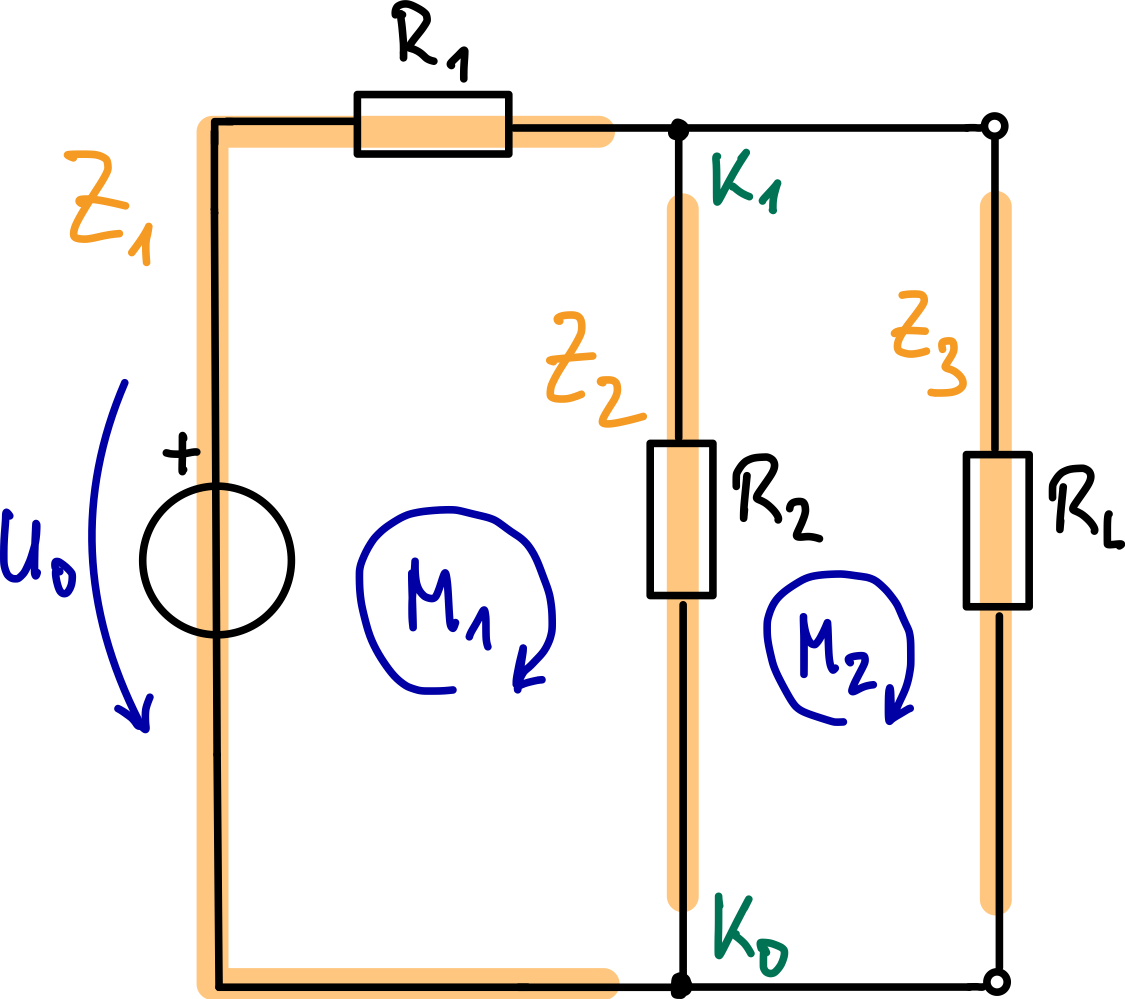 Die Spannungsquelle liegt in Reihe mit und bildet zusammen einen Zweig. Alternativ könnte man sie als separaten Zweig zählen, was zu , , führt – das Ergebnis für bleibt gleich.